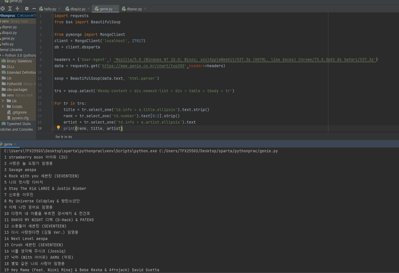 파이썬을 이용해 지니뮤직 차트를 크롤링해 보았습니다